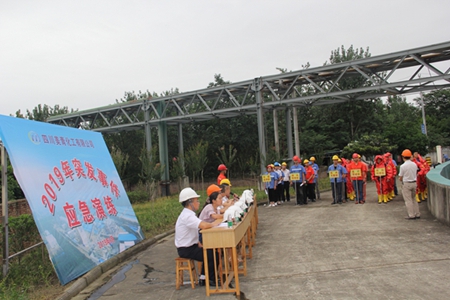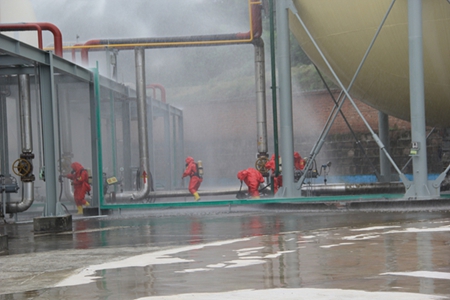 上午9点,演练正式开始。水汽车间一名操作工在巡检过程中发现液氨罐区D号液氨球罐底部出口管法兰处泄露,该操作工当即向当班班长、调度和车间主任报告,调度立即通知合成氨岗位减负荷运行,将产氨单独倒入C号罐,事故D号罐单独切出系统。同时上报公司应急指挥中心,应急指挥中心立即下达启动安全生产事故应急预案,各级应急人员按职责分工立即进入应急状态,并与射洪县消防大队、美丰管委会等相关部门联合,紧急疏散液氨罐区周边人员。现场应急人员同时开启罐区消防水炮对泄露液氨进行稀释吸收,现场抢险人员按照生技部操作流程,成功将D号罐内的液氨倒至B号罐,并对D号罐进行卸压、置换和清洗。9点45分,抢修组向现场指挥报告泄露点处置成功,应急演练顺利完成。