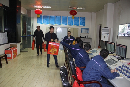 他们先后来到生产调度室、合成总控室、尿素总控室、合成巡检室、泵房巡检室、110KVA变电站值班室、压缩机值班室、循环水值班室、液氨球罐值班室等岗位,向坚守在工作岗位的员工送去礼品和春节祝福。
